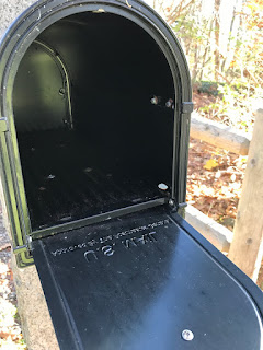I left for yoga at 9:20 and returned at 11:15. I went down to bring up the trash barrel and checked the mailbox--though I saw the mail carrier on my way home, so I did not expect the mail to have been delivered.